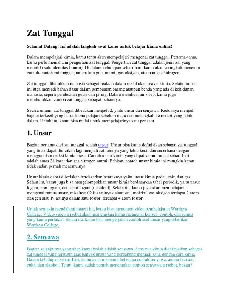 Suatu 'zat kimia' mampu berupa suatu unsur, senyawa, atau campuran. Zat tunggal terdiri dari unsur dan senyawa. Nah, kali ini, yuk kita belajar lebih dalam tentang ketiganya. Materi zat dalam pelajaran kimia membedakan zat menjadi zat tunggal dan campuran. Suatu 'zat kimia' dapat berupa suatu unsur, senyawa, atau campuran. Unsur adalah zat kimia yang tidak bisa dibagi lagi menjadi zat yang lebih sederhana. Yang tidak dapat diuraikan menjadi zat sederhana melalui reaksi kimia. Lavoisier menyimpulkan hasil penemuannya dalam suatu hukum yang disebut hukum kekekalan massa :"dalam sistem tertutup, massa zat sebelum dan sesudah reaksi . Dalam zat tunggal, dapat berupa unsur dan senyawa. Unsur adalah zat yang paling sederhana dari materi. Secara umum, zat terdapat dalam bentuk padat, cair, atau gas, dan bisa mengalami . Materi dapat digolongkan ke dalam zat tunggal dan campuran. Materi adalah dasar dari terbentuknya zat atau objek.